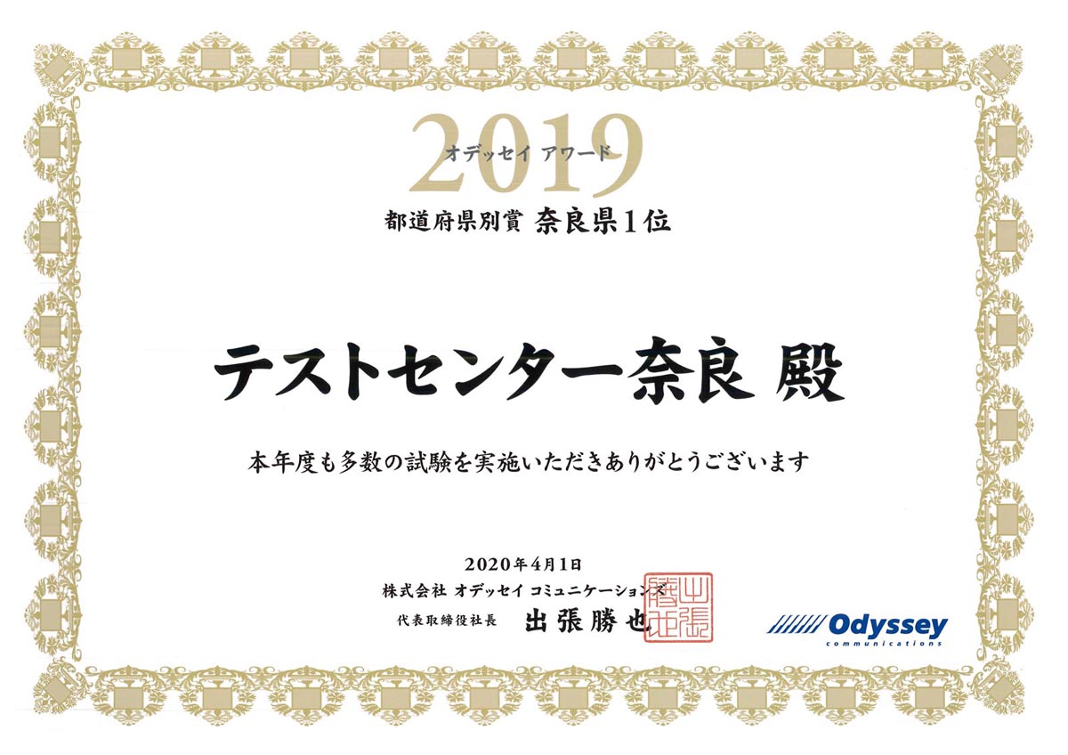オデッセイアワードはMOSなどの試験を行っている株式会社オデッセイコミュニケーションズが、各都道府県などの試験実施数の多い試験会場を表彰する制度です。テストセンター奈良は2017年度~2021年度まで5期連続で都道府県別賞を受賞しております。