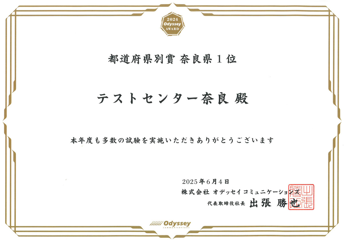 オデッセイアワードはMOSなどの試験を行っている株式会社オデッセイコミュニケーションズが、各都道府県などの試験実施数の多い試験会場を表彰する制度です。テストセンター奈良は2017年度~2023年度まで7期連続で都道府県別賞を受賞しており、2019年度からは連続5年間奈良県内試験数1位の会場として表彰されております。
